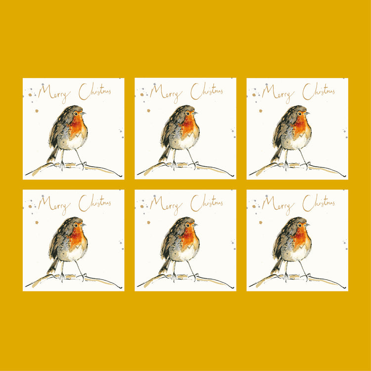 A pack of six gold foil embossed Christmas card illustrated with a cute as can be rosey red Robin and the hand written text ‘Merry Christmas’.