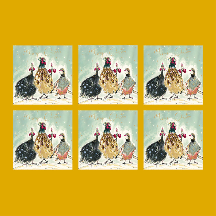 A pack of six gold foil embossed Christmas card illustrated with a Pheasant, a Partridge and to cheeky Guinea Foul huddled under the falling snow and the hand written text ‘Merry Christmas’.