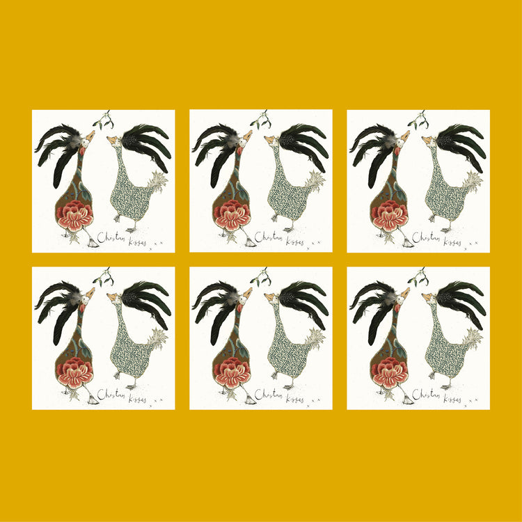 A pack of six Christmas cards illustrated with two geese under the mistletoe and the hand written text ‘Christmas Kisses’.