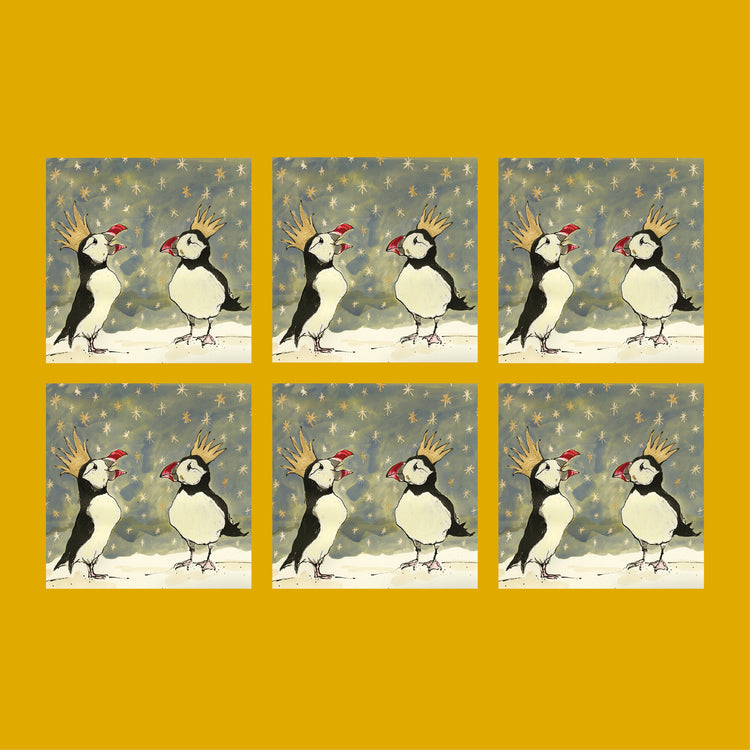 A pack of six Christmas cards illustrated with two happy puffins, wearing their golden party hats, and enjoying the starlit sky.