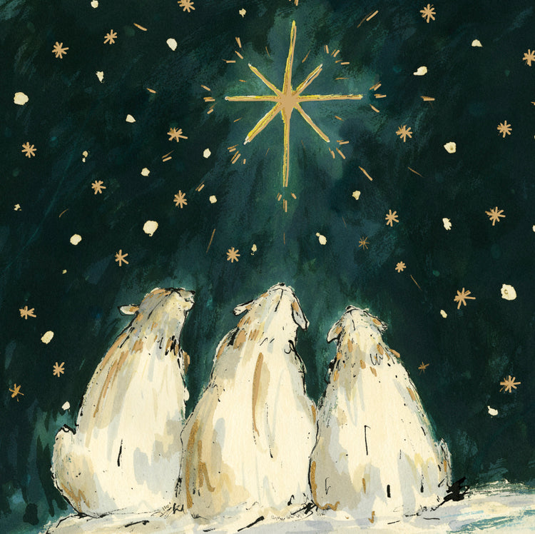A gold foil embossed Christmas card illustrated with three snuggling polar bears gazing into the starry sky.