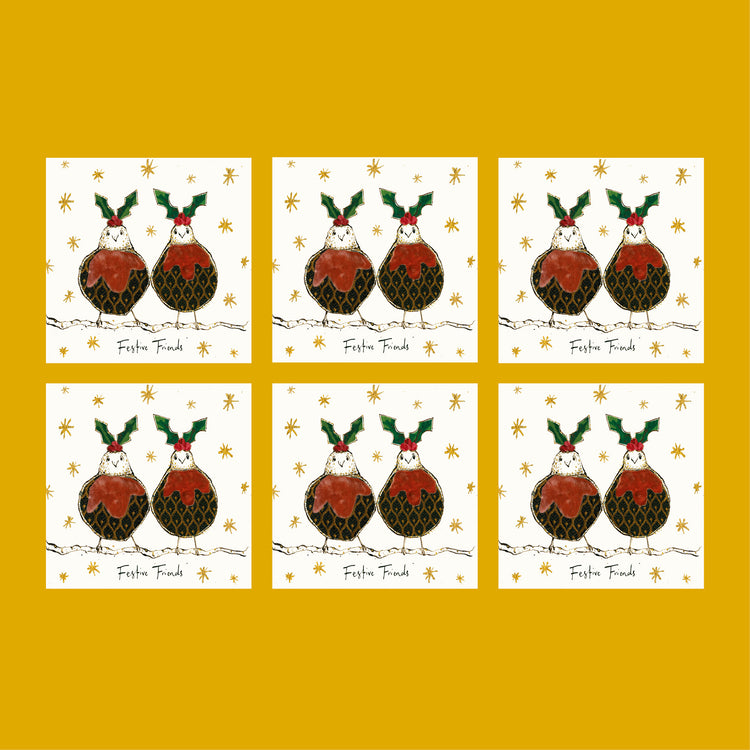 A pack of six Christmas cards illustrated with two plump robins, dressed as Christmas puddings, amongst the starry sky and the handwritten text ‘Festive Friends’.