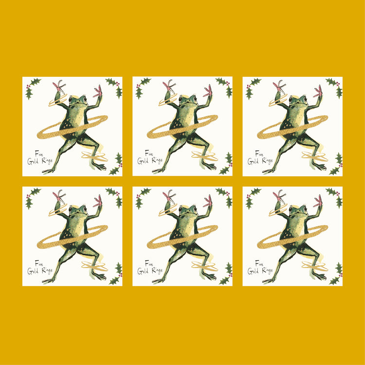 A pack of six Christmas cards illustrated with a gold ring hula hooping frog and the hand written text ‘Five Gold Rings’.