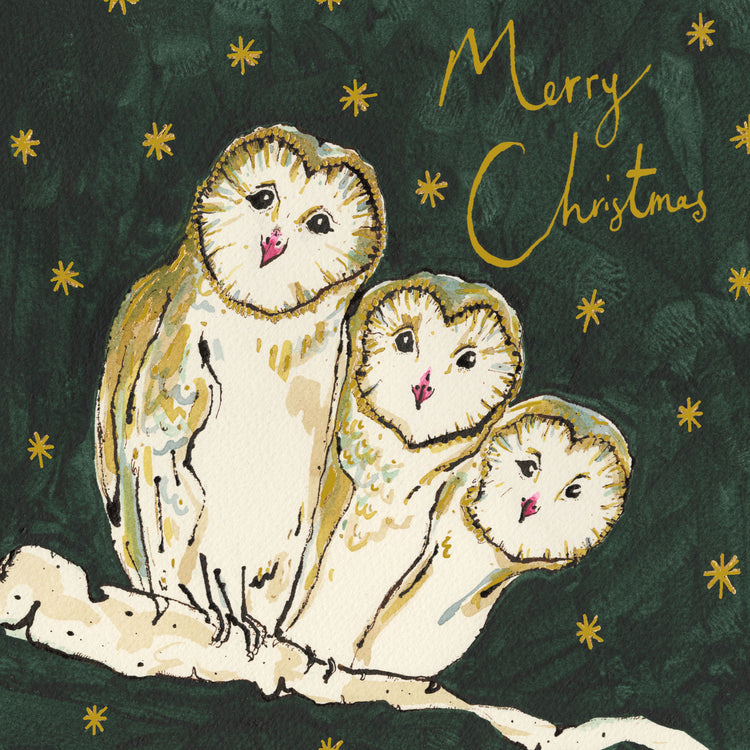 A gold foil embossed Christmas card illustrated with three wise owls gazing into the starry sky and the handwritten text 'Merry Christmas'.