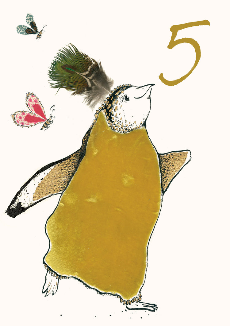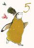 A gold foil embossed 5th birthday card illustrated with a happy dancing penguin and the handwritten number ’5’.