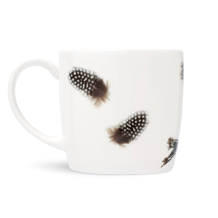 A fine bone china mug made in the UK. Illustrated with two colourful birds on the outside, the handwritten text ‘Best Buds’ on the inside of the lip and a spotted feather inside on the base, so there’s a wee surprise when you finish your cup of tea…
