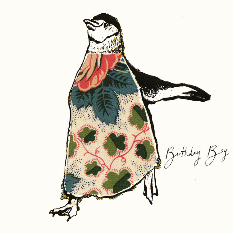 A birthday card illustrated with a happy blue patterned penguin and the handwritten text ‘Birthday Boy’.