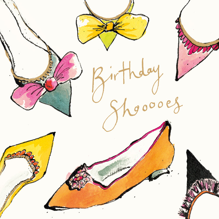 A gold foil embossed birthday card illustrated with a collection of colourful shoes and the handwritten text ’Birthday Shoooes’.