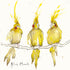 A greetings card illustrated with three blonde Cockatoos and the handwritten text ‘Blond Moments’.