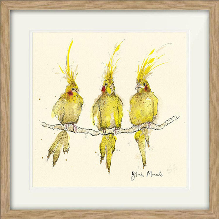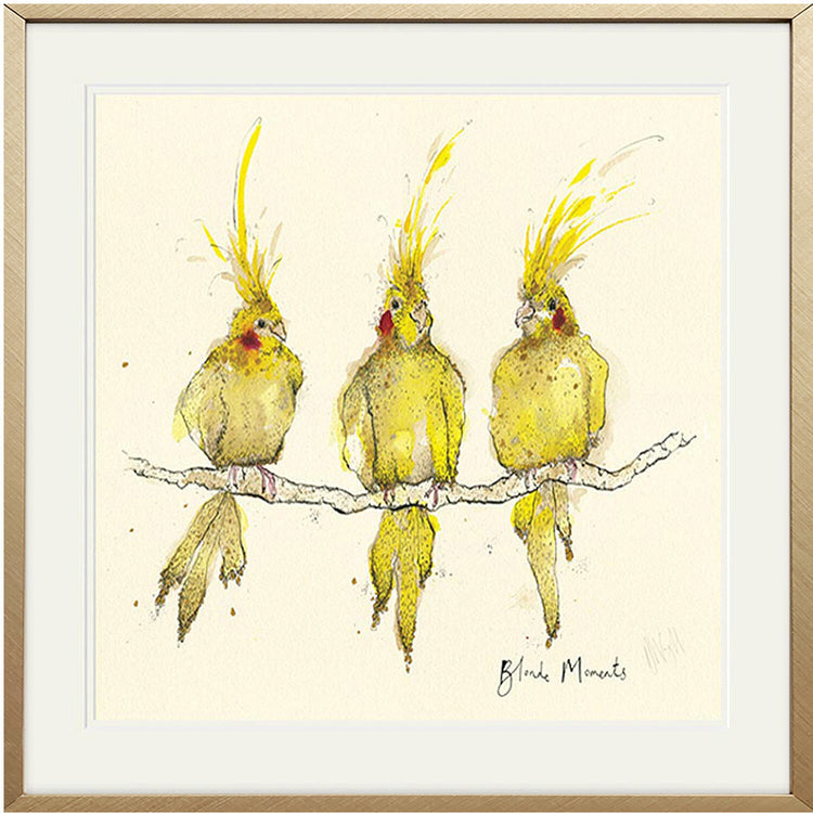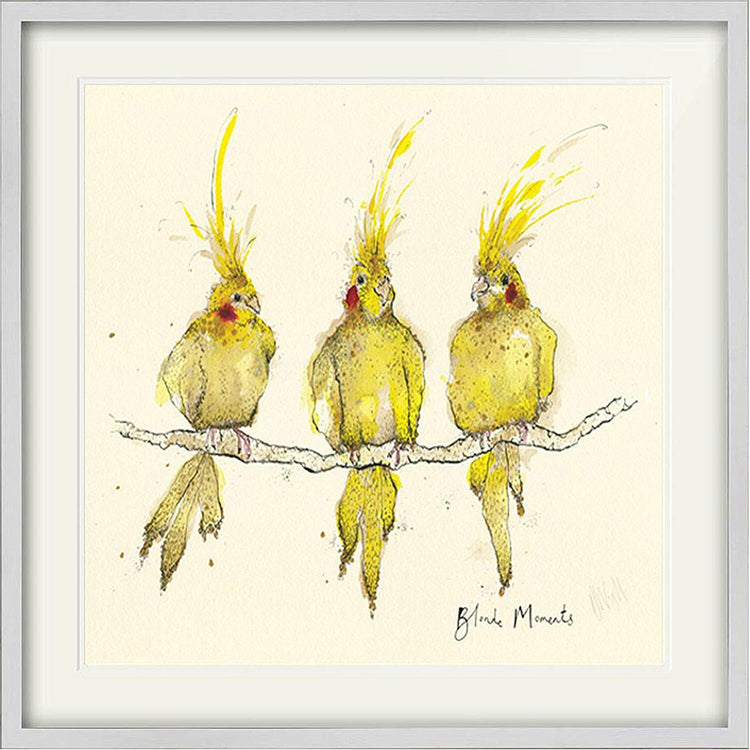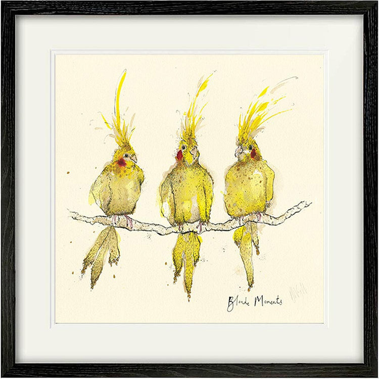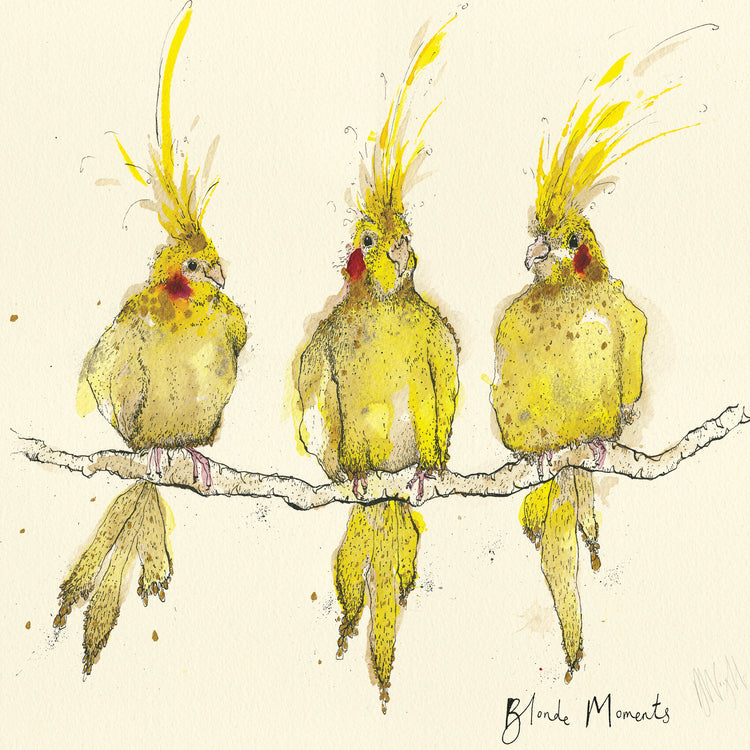A high-quality giclee print of three blonde Cockatoos, with the handwritten text 'Blonde Moments'.