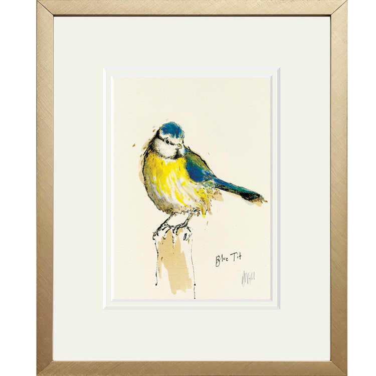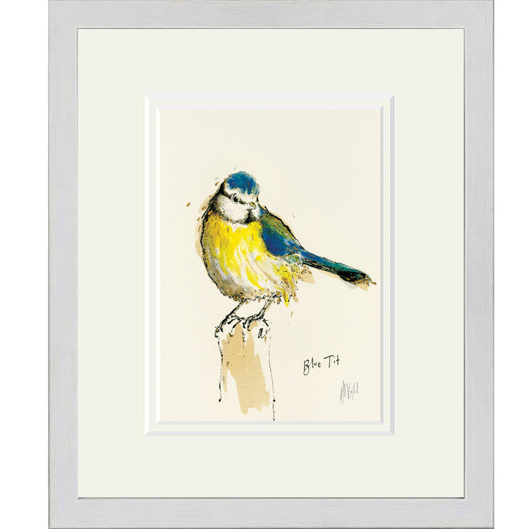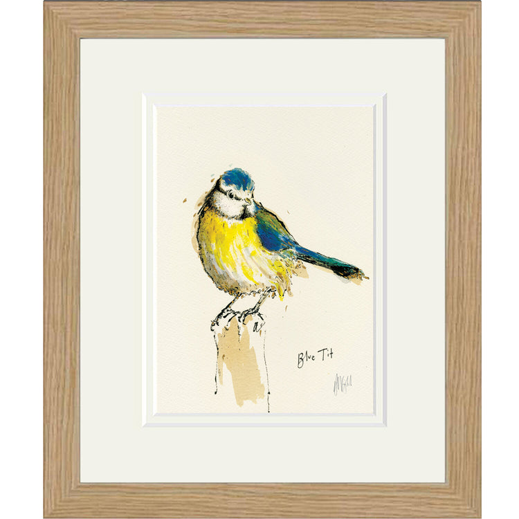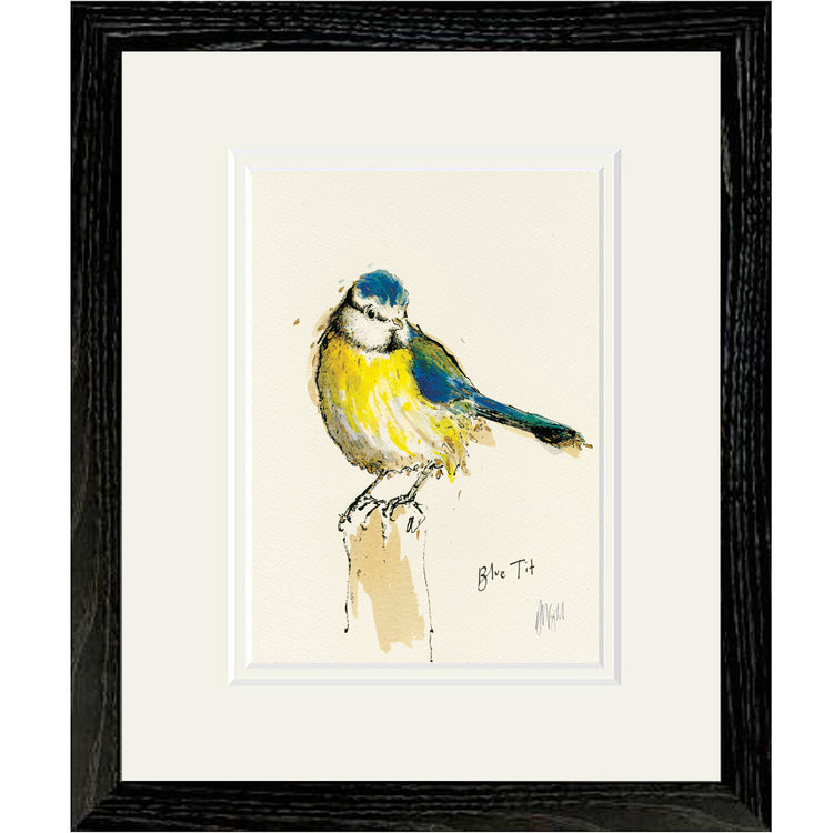 A high-quality giclee print of a Blue Tit perched on a post, with the handwritten text 'Blue Tit'.