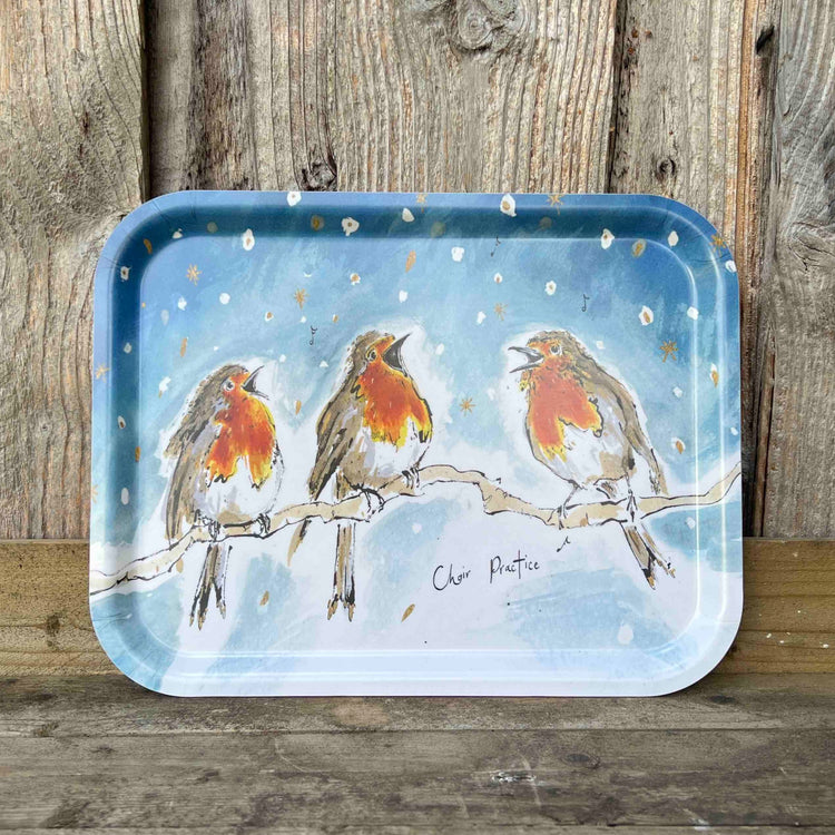 A birch veneer tray with a melamine surface illustrated with three singing, red breasted, robins and the handwritten text 'Choir Practice'.