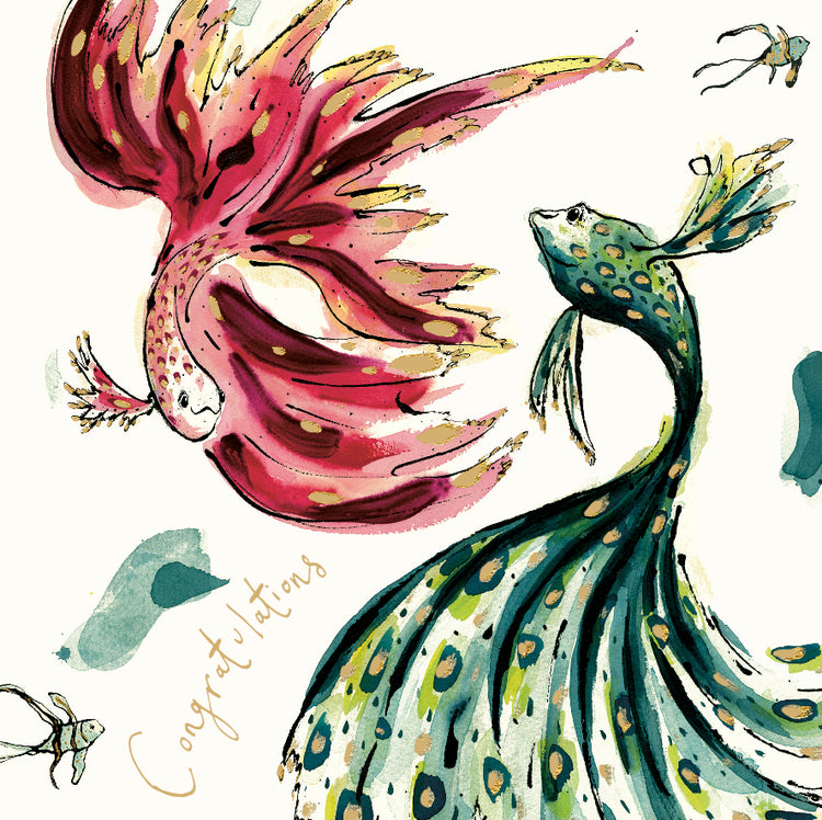 A gold foil embossed card illustrated with two colourful dancing fish and the handwritten text ‘Congratulations’.