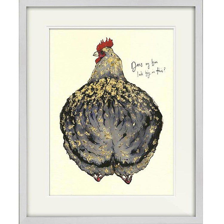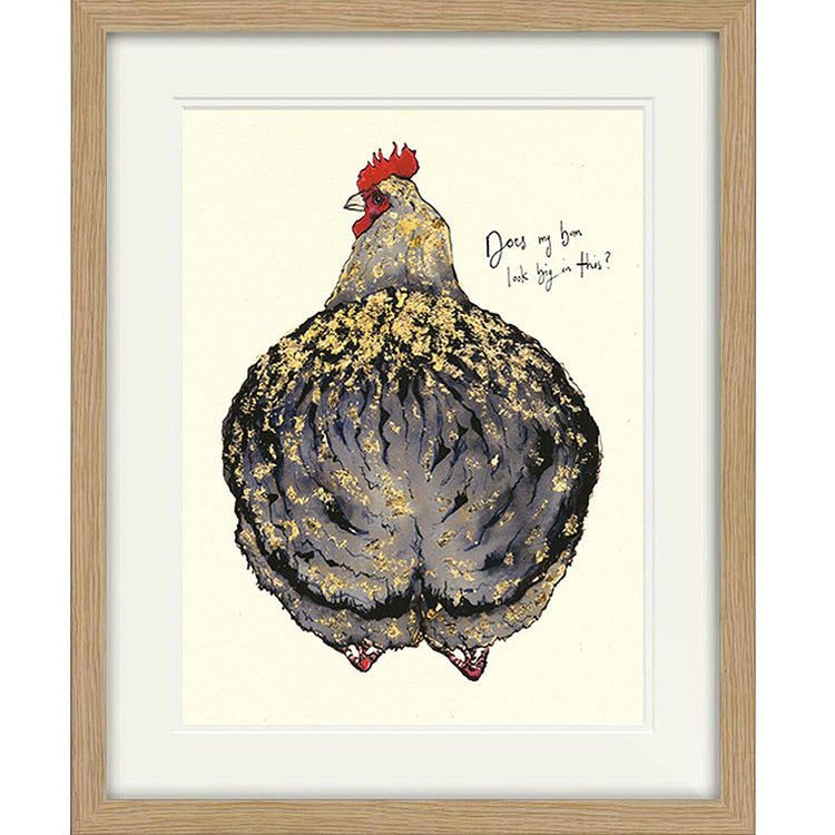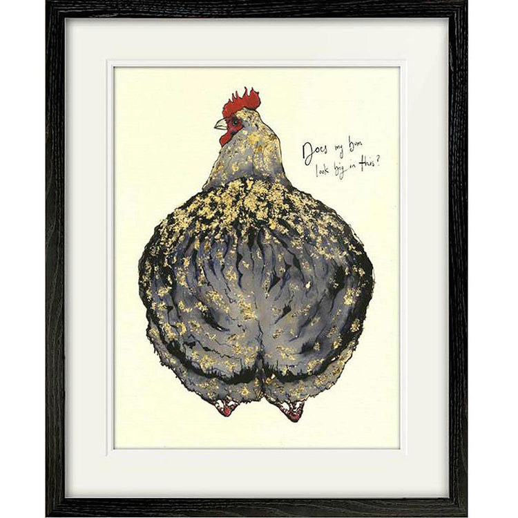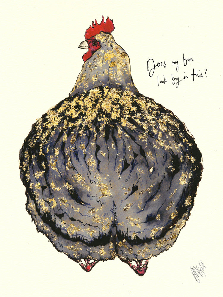 A high-quality giclee print of a big bottomed Chicken, with the handwritten text ' Does my bum look big in this?'.