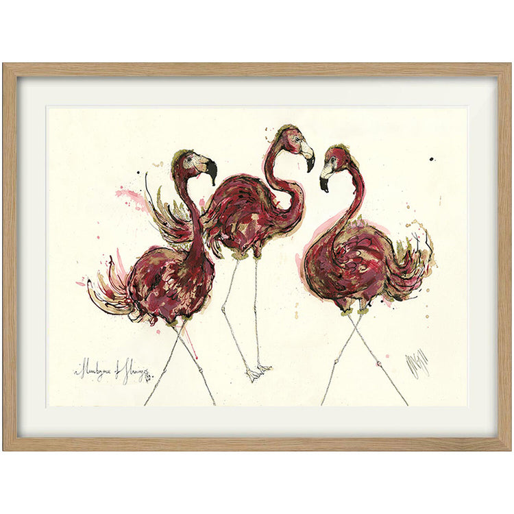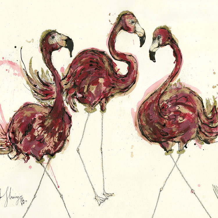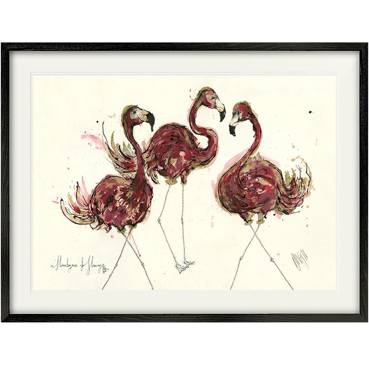 A high-quality giclee print of three flamboyant Flamingoes, with the handwritten text 'a flamboyance of Flamingoes'.