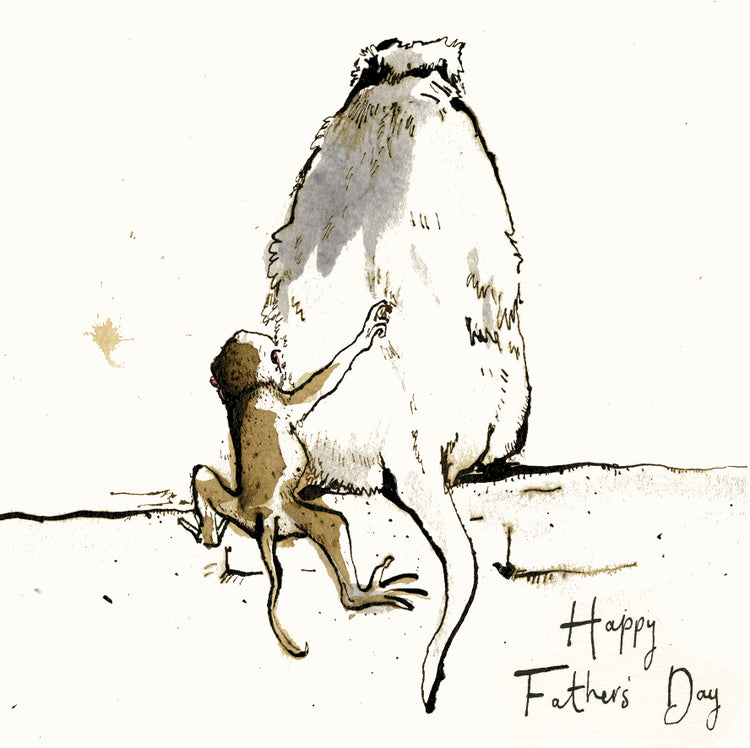 A greetings card illustrated with a little monkey and their dad and the handwritten text ‘Happy Father’s Day’.