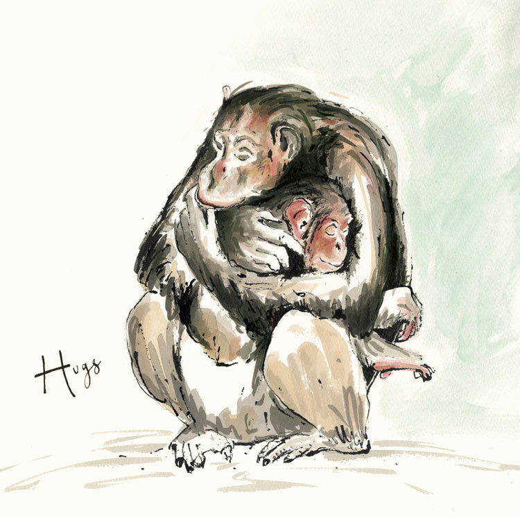 A greetings card illustrated with a mother Chimpanzee holding her child and the handwritten text ‘Hugs’.