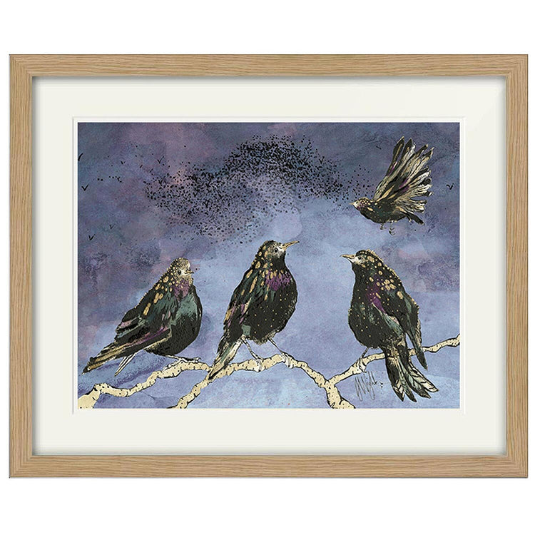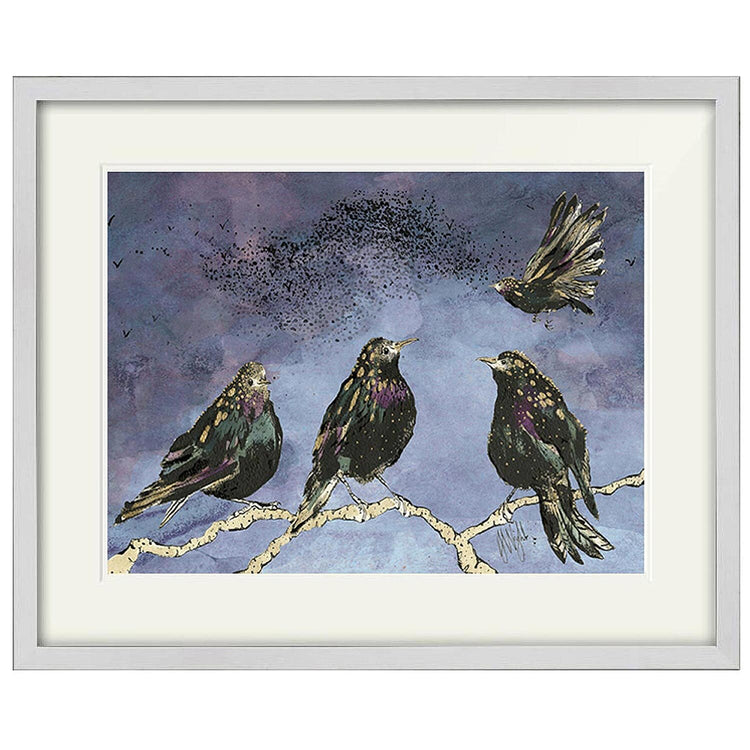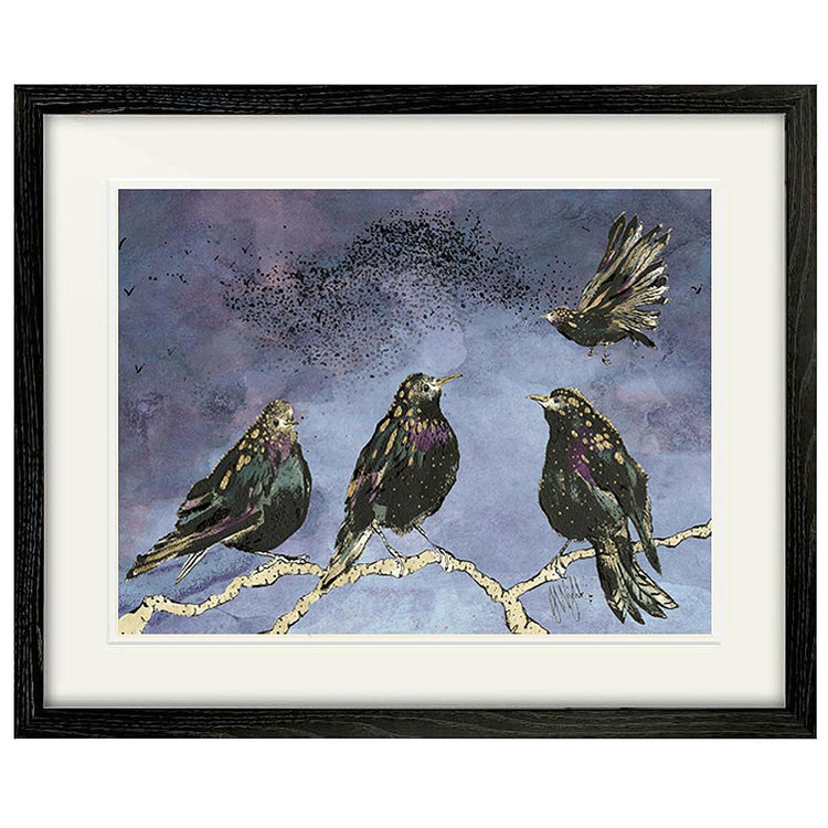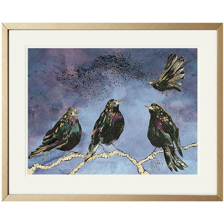 A high-quality giclee print of four Starlings and a murmuration of their friends.