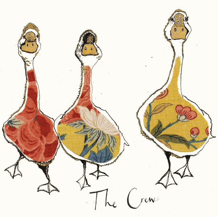 A greetings card illustrated with three dapper Ducks and the handwritten text ‘The Crew’.