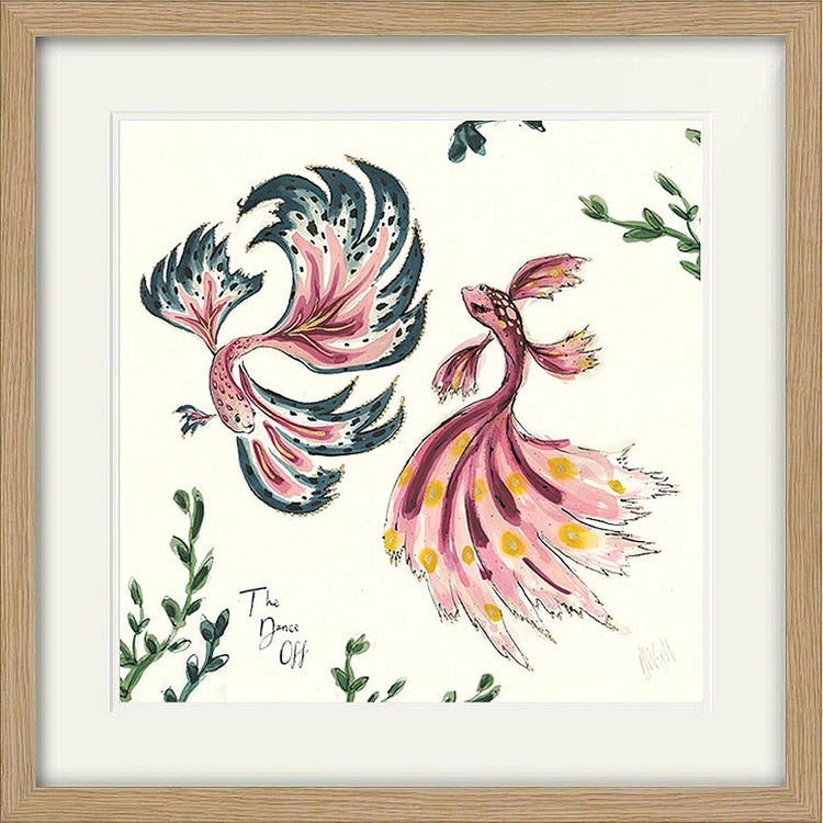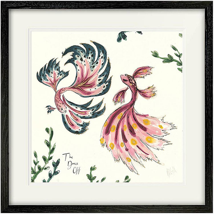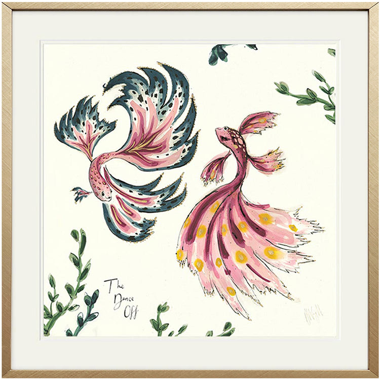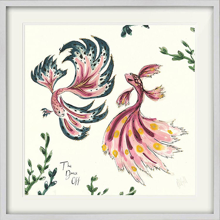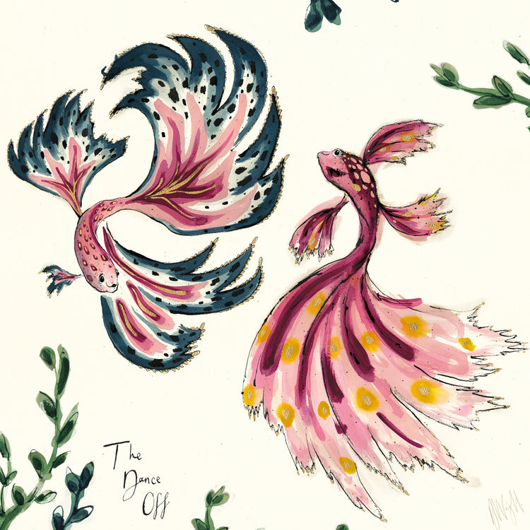 A high-quality giclee print of two colourful, dancing fish, with the handwritten text 'The Dance Off'.