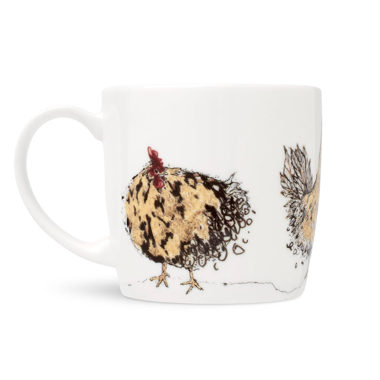 A fine bone china mug made in the UK. Illustrated with three golden hens on the outside, the handwritten text ‘The Golden Ladies’ on the inside of the lip and a hen hiding inside on the base, so there’s a wee surprise when you finish your cup of tea…
