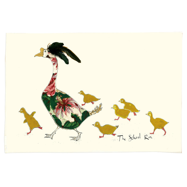A handmade cotton tea towel illustrated with a colourful mother goose and her velvety goslings, with the handwritten text ‘The School Run’.