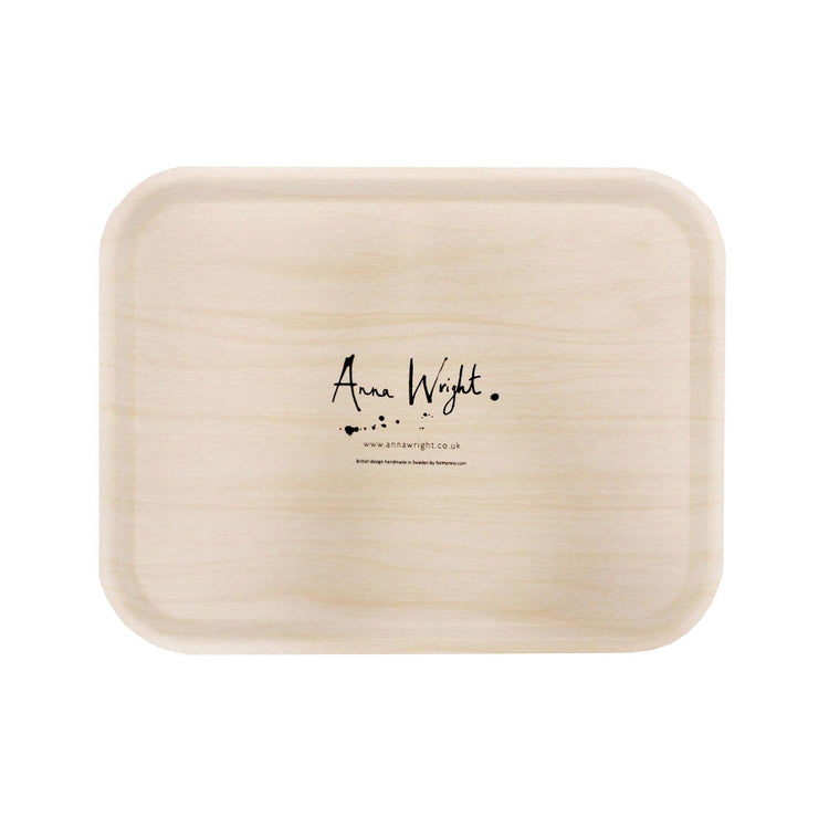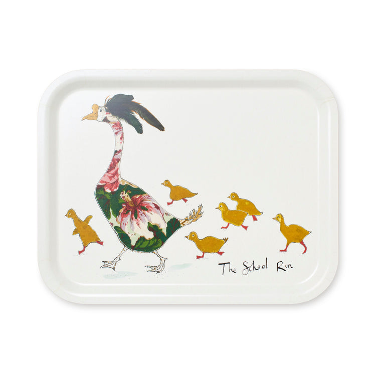 A birch veneer tray with a melamine surface illustrated with a colourful mother goose and her velvety goslings, with the handwritten text ‘The School Run’.