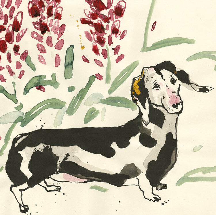 A greetings card illustrated with a Daschund and a clump of pink lupins.