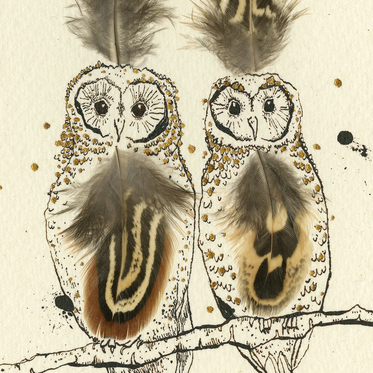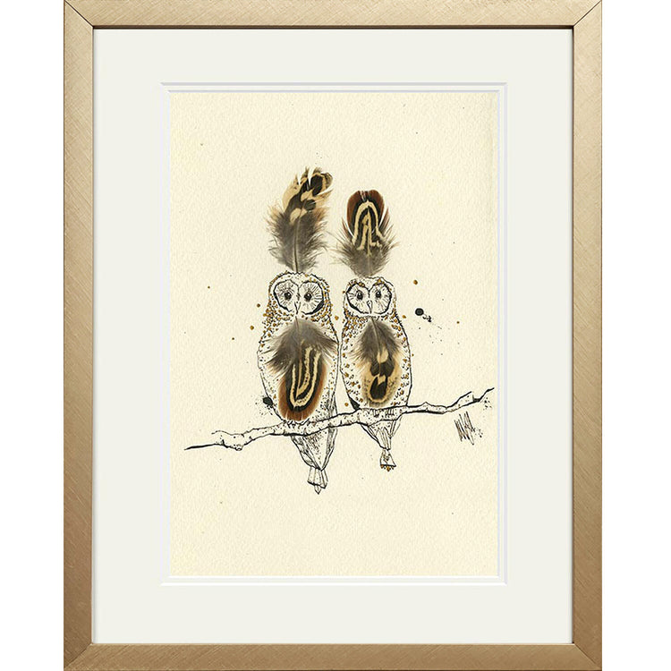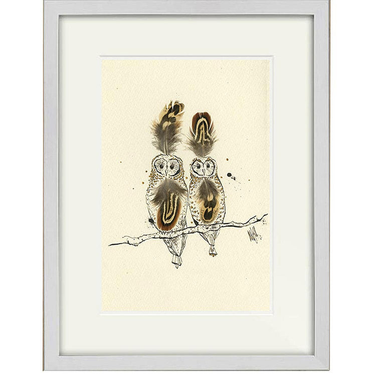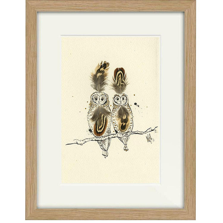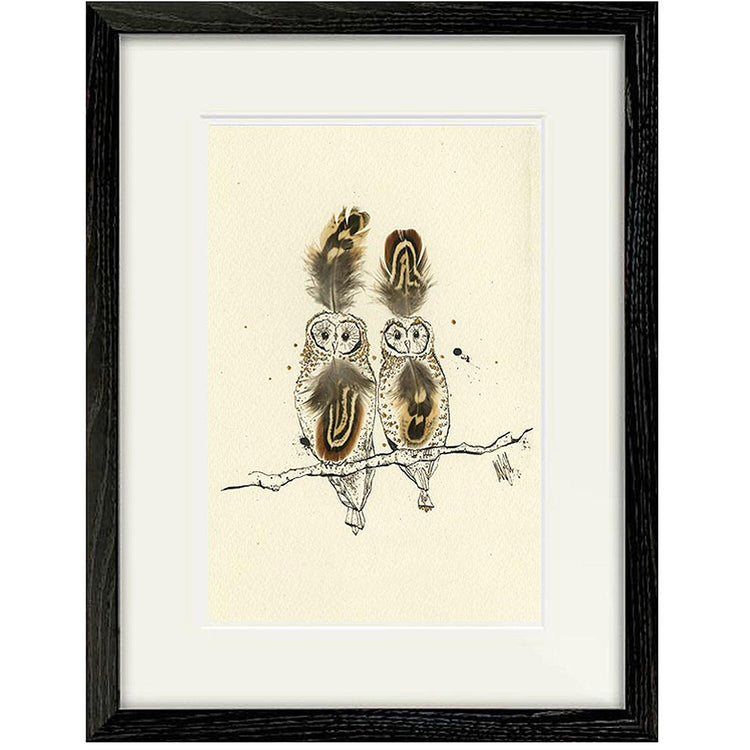 A high-quality giclee print of two feathered owls perched on a branch.