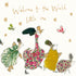 A gold foil embossed greetings card illustrated with a happy bunch of colourful animals and the handwritten text ‘Welcome to the World little one’.