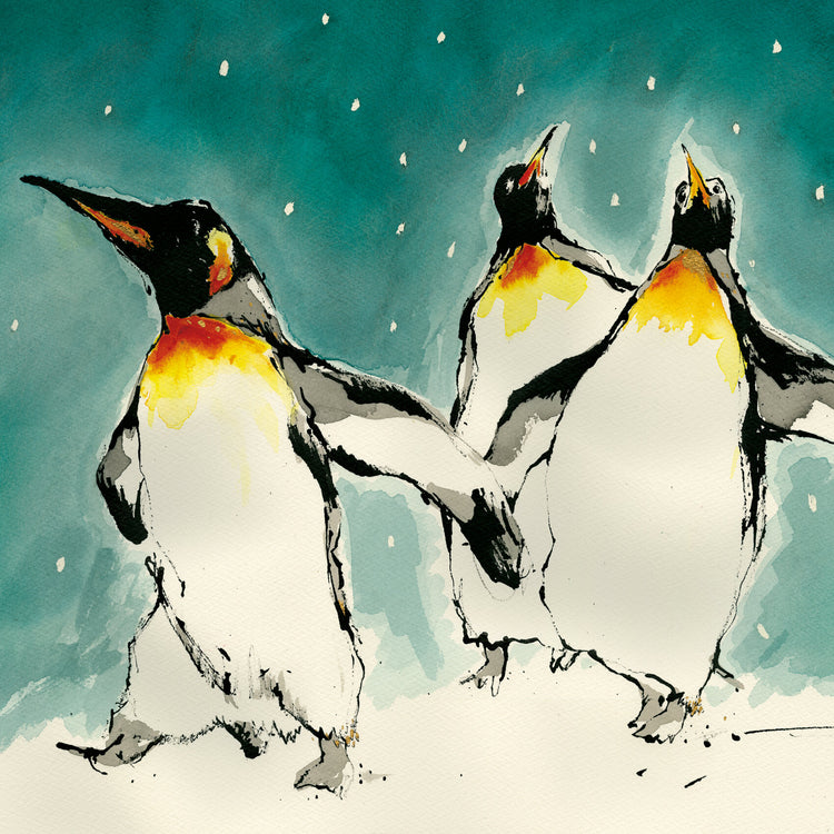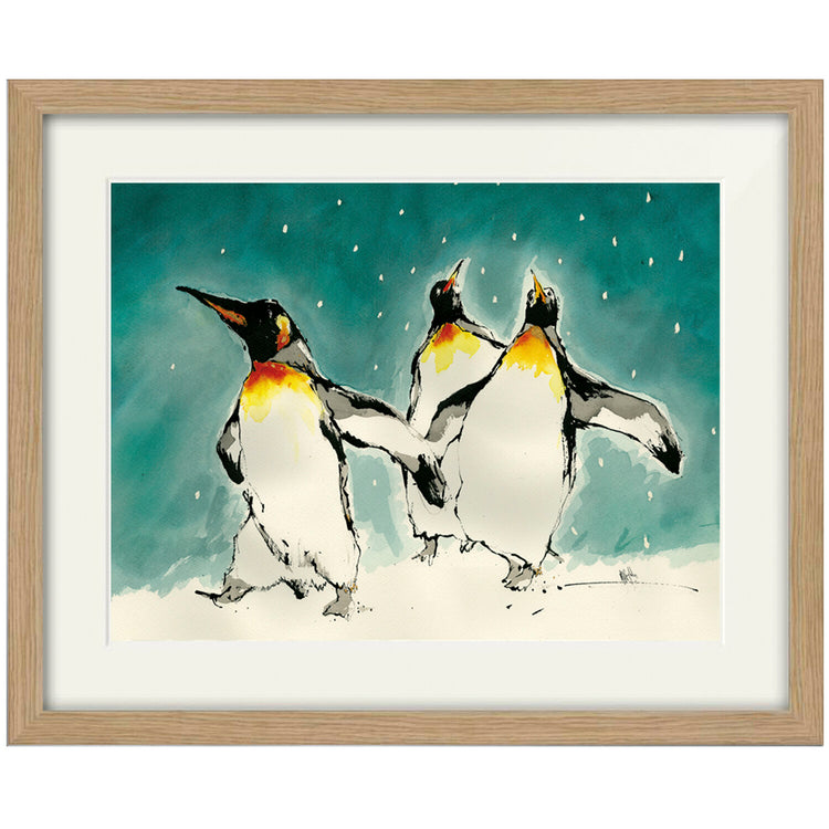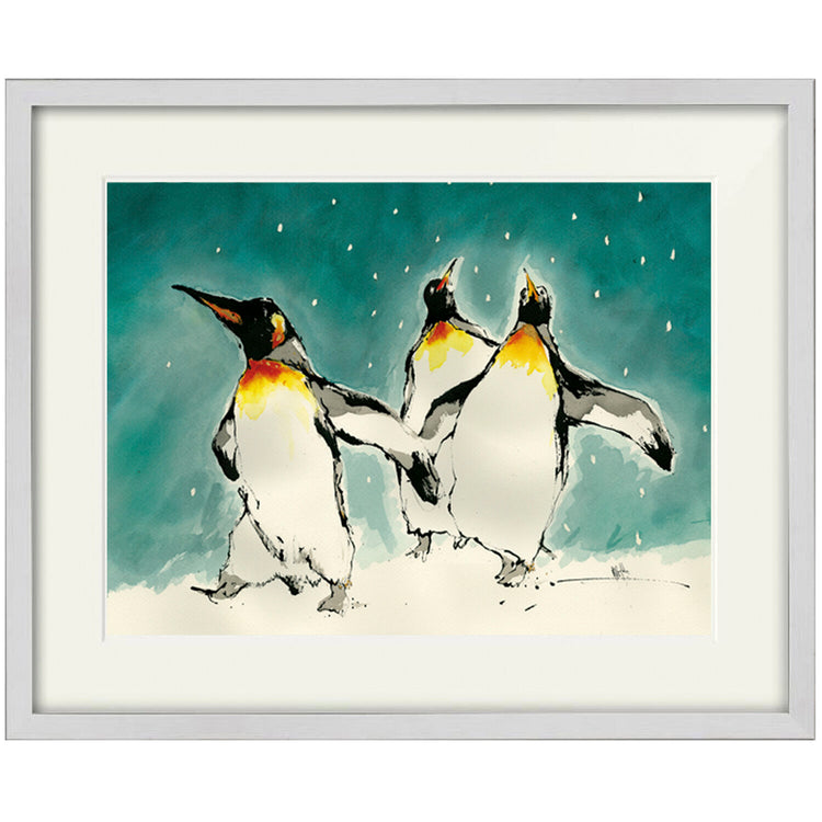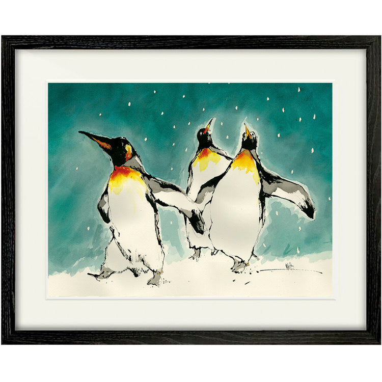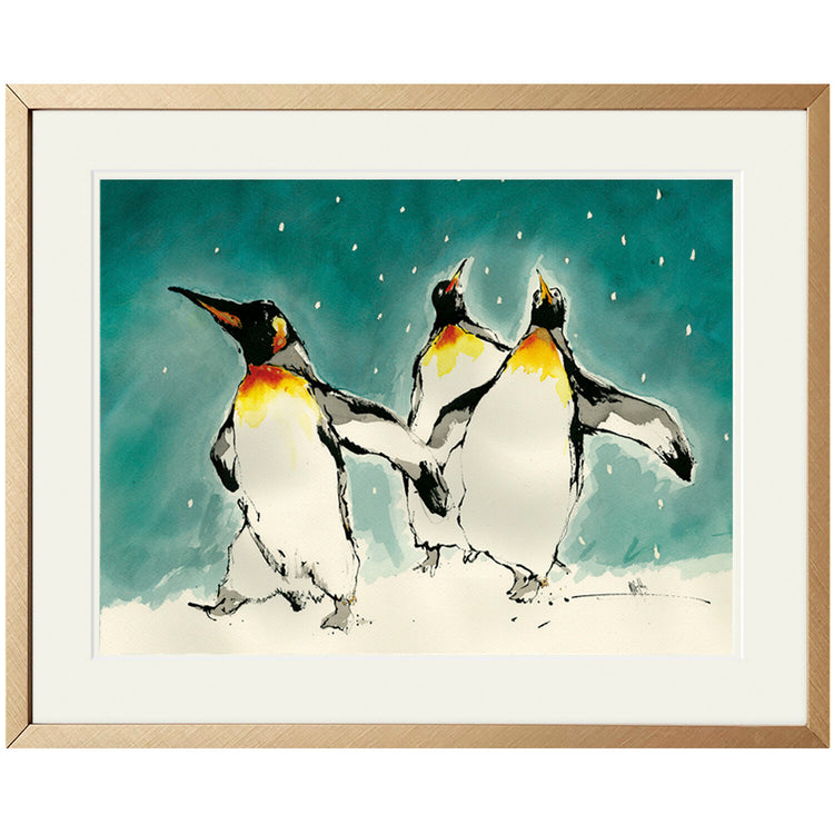 A high-quality giclee print of three friendly Penguins wandering through the snow.