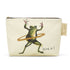 A handmade cotton make-up bag illustrated with a hula hooping frog and the handwritten text ‘Work it! on the front, and a hand drawn pattern on the back.