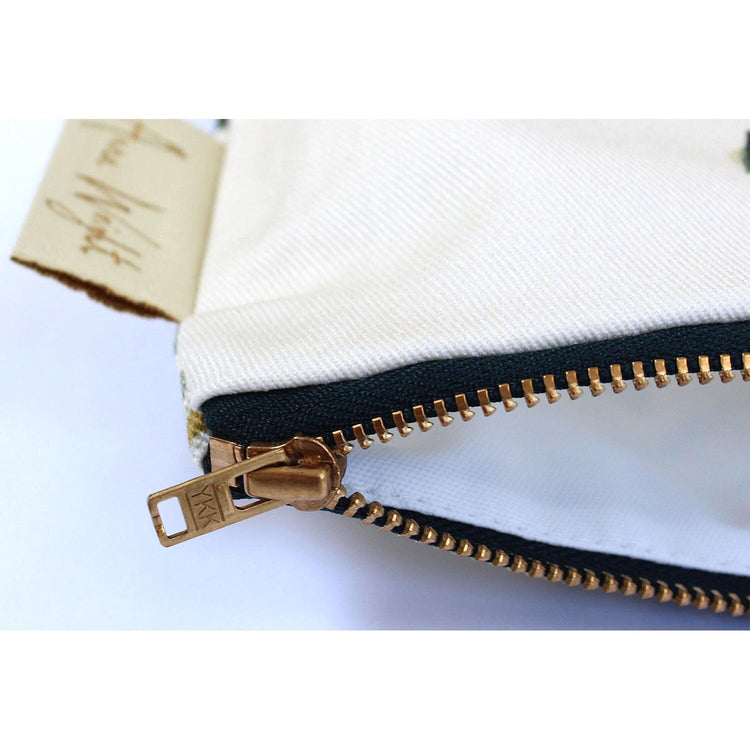 - Printed onto a cotton cloth outer with a sturdy waterproof lining and a high-quality solid brass zip