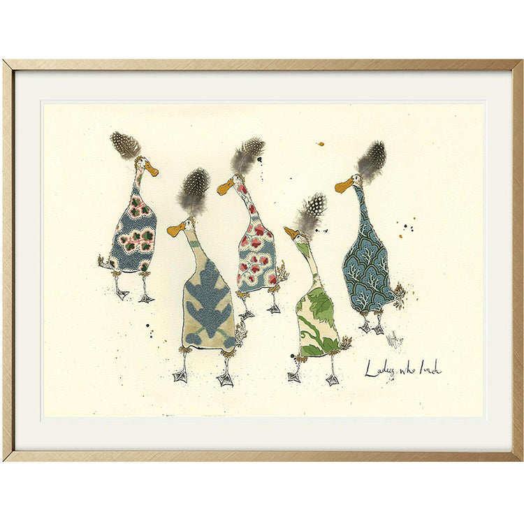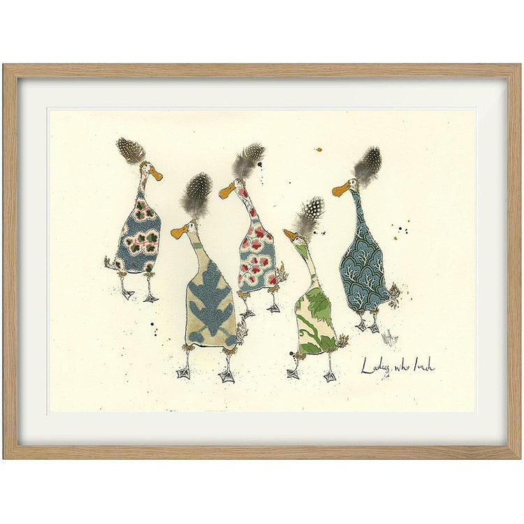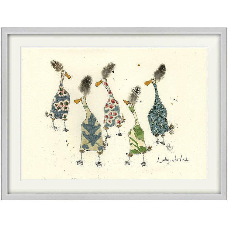 A high-quality giclee print of five patterned ducks, with the handwritten text 'Ladies who lunch'.