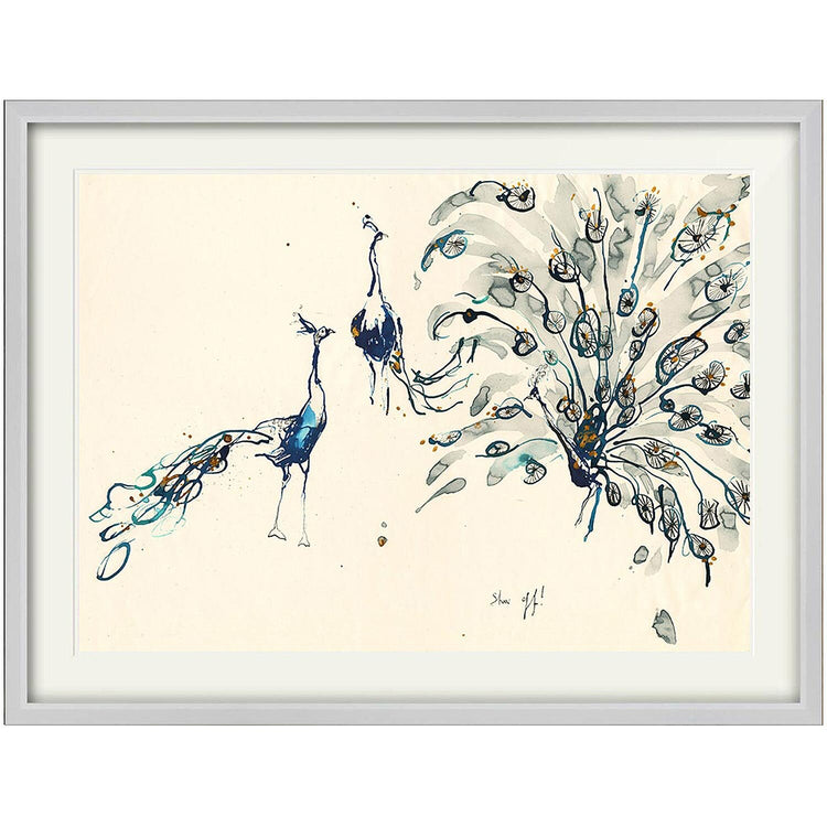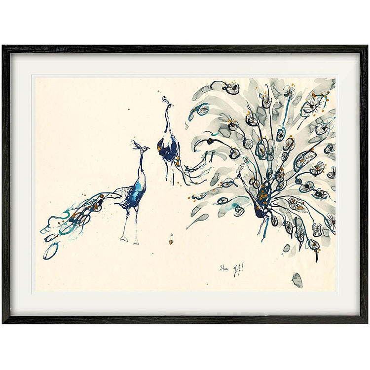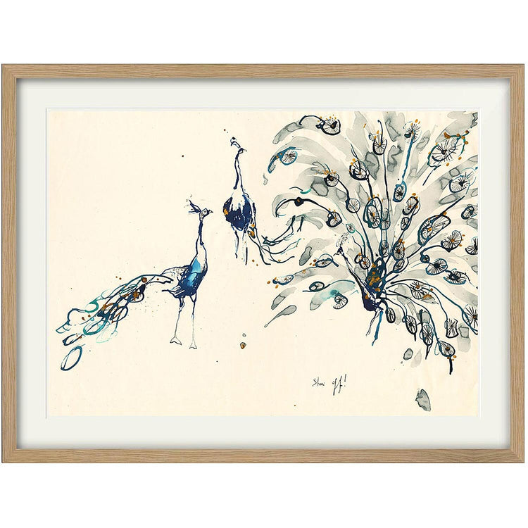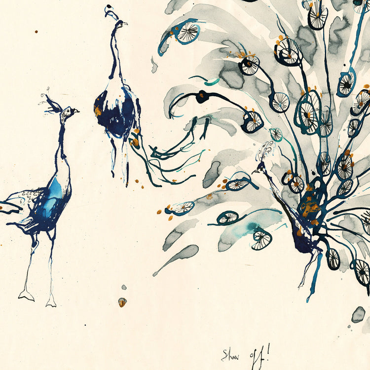 A high-quality giclee print of three magnificent Peacocks, with the handwritten text 'Show off!'