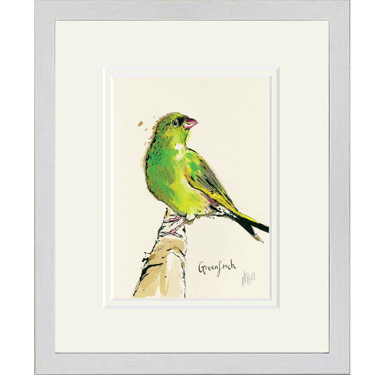 A high-quality giclee print of a Greenfinch perched on a branch, with the handwritten text 'Greenfinch'.