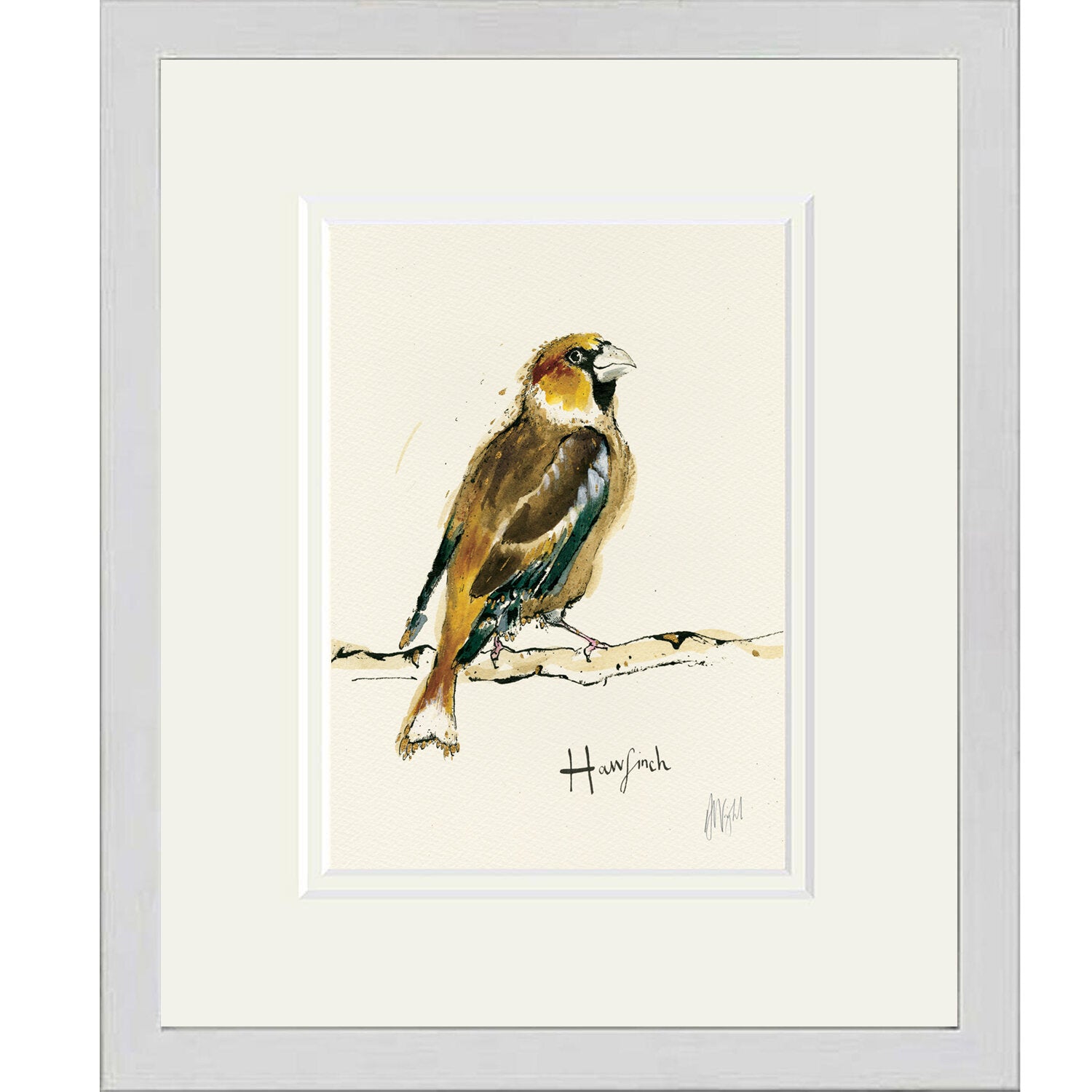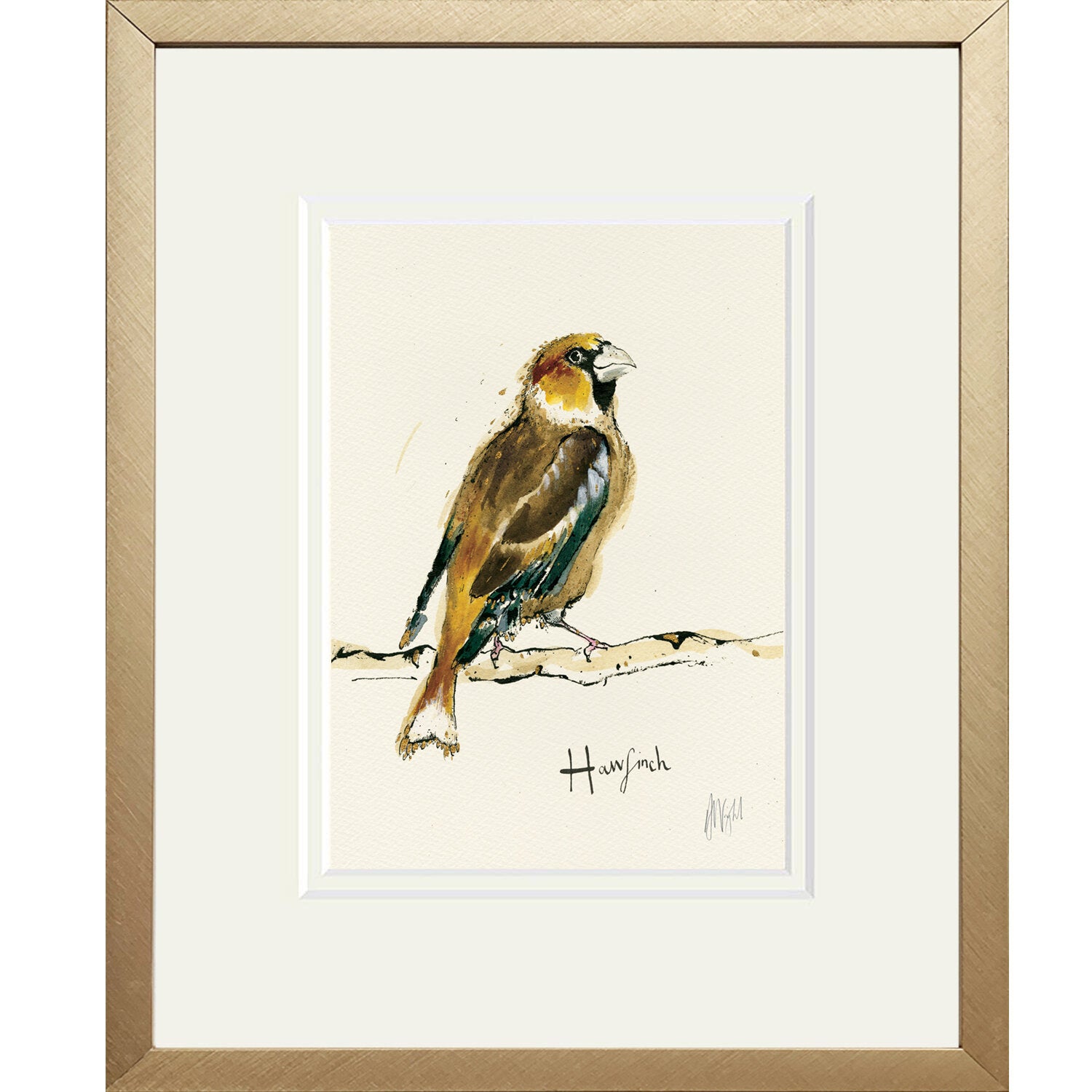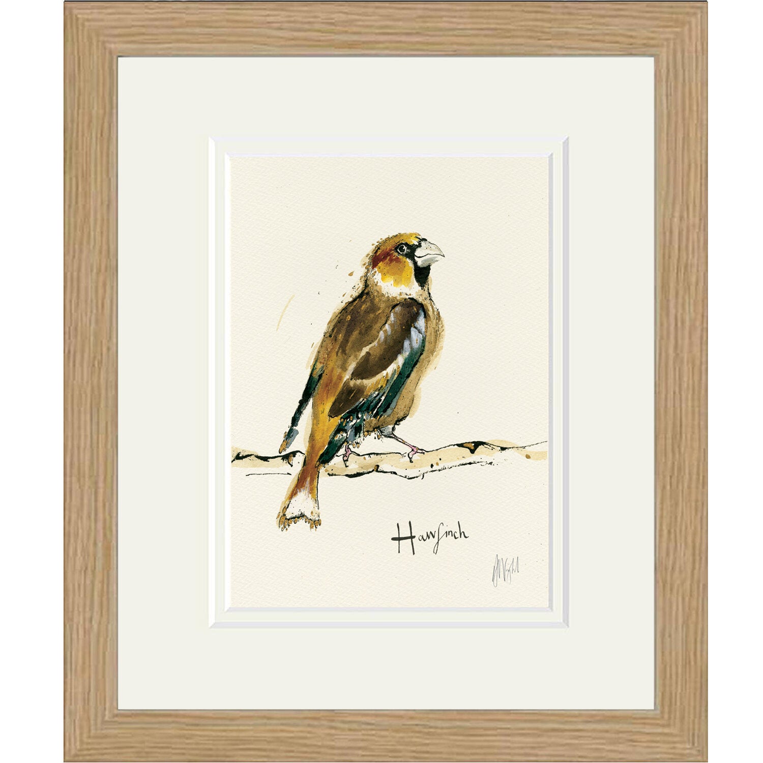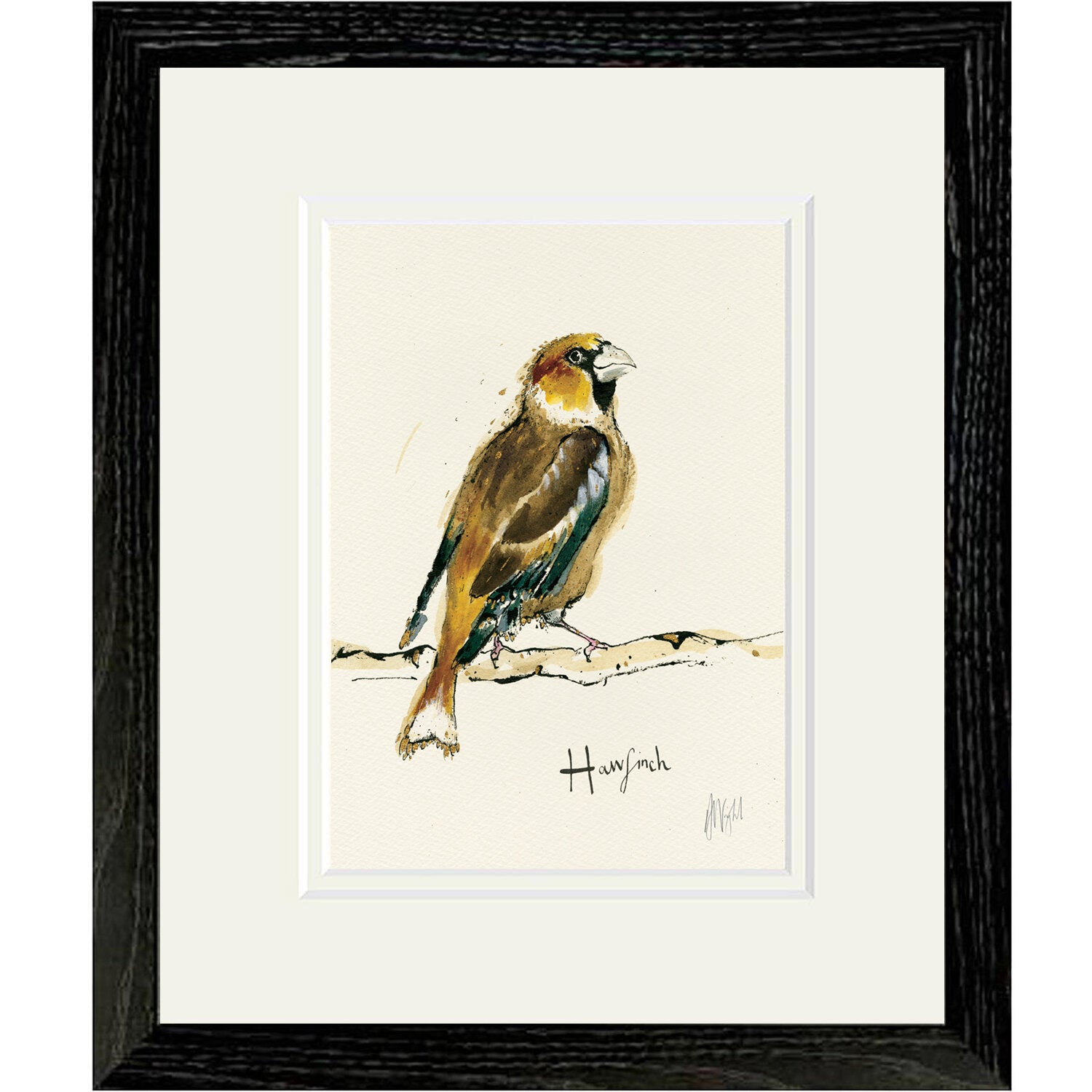 A high-quality giclee print of a Hawfinch perched on a branch, with the handwritten text 'Hawfinch'.