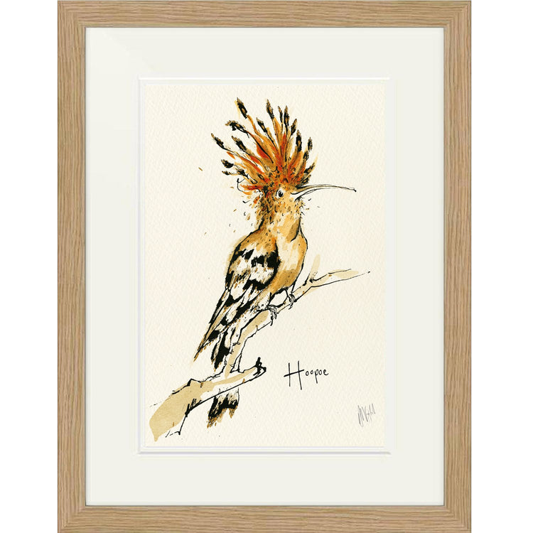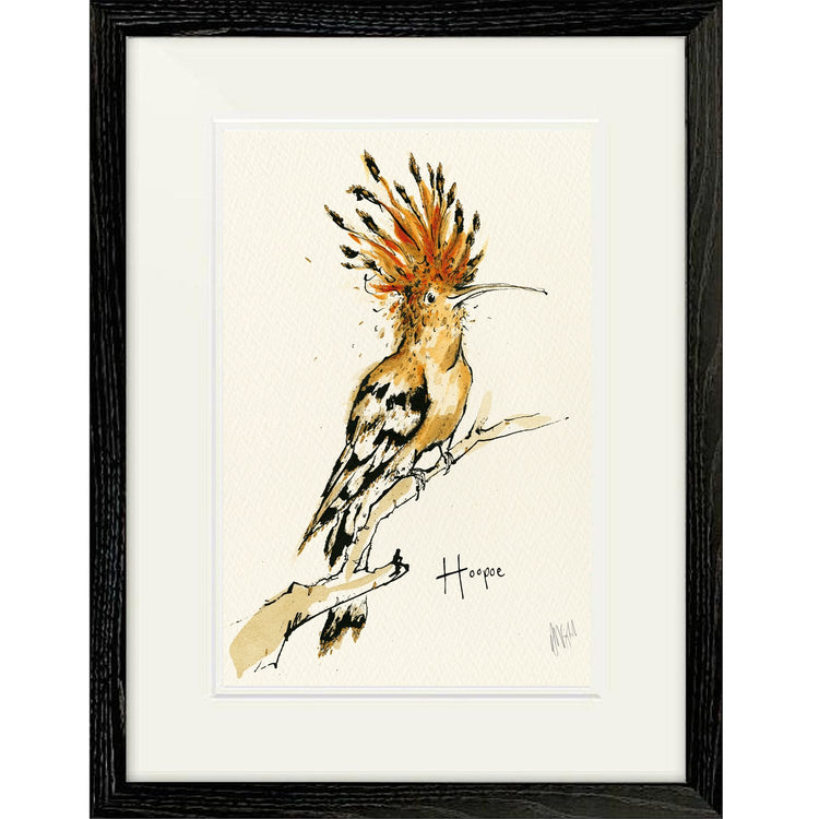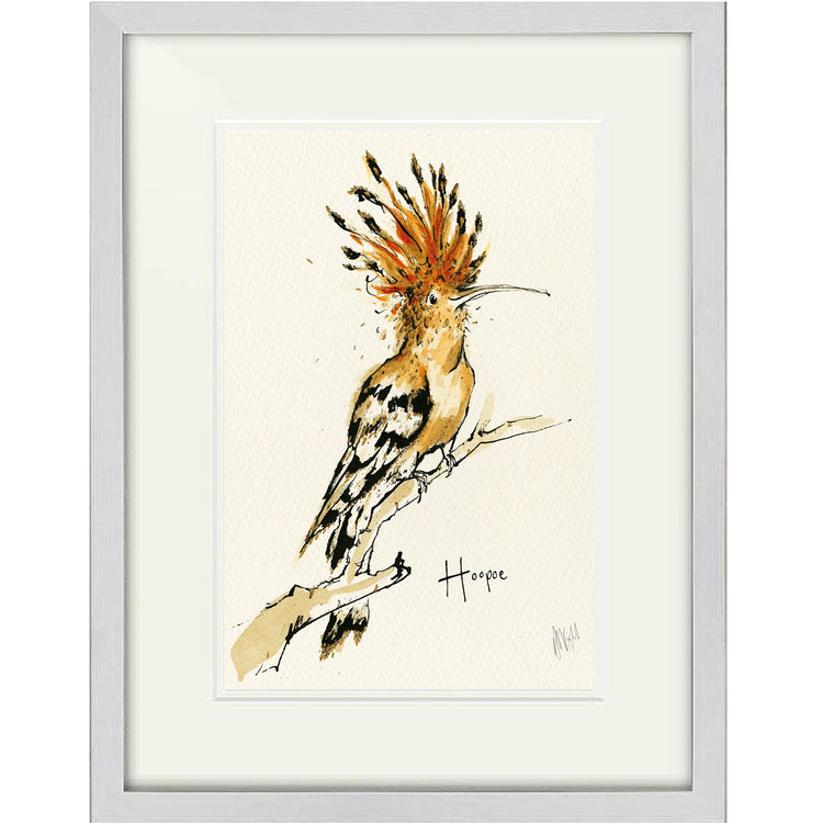 A high-quality giclee print of a Hoopoe perched on a branch, with the handwritten text 'Hoopoe'.