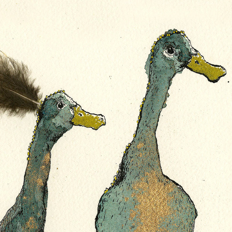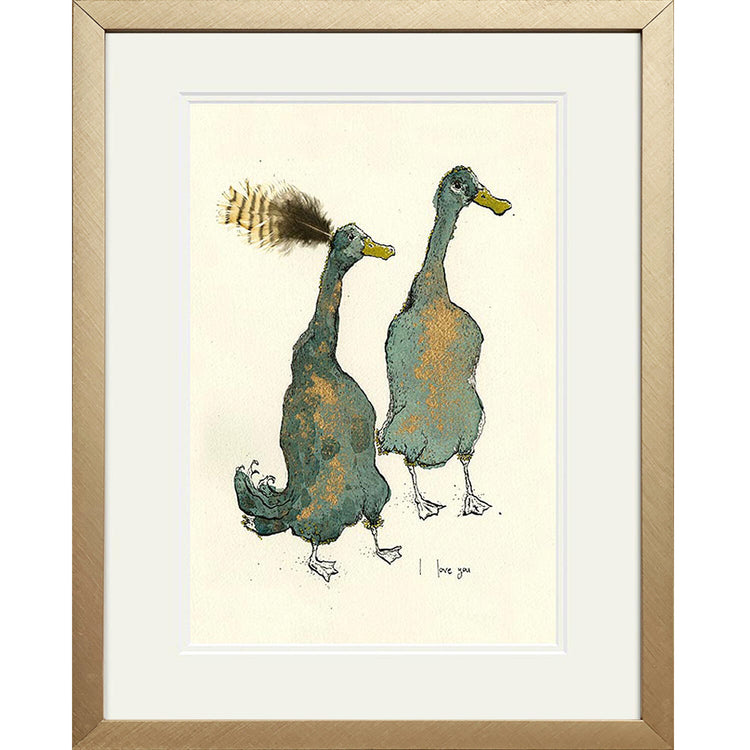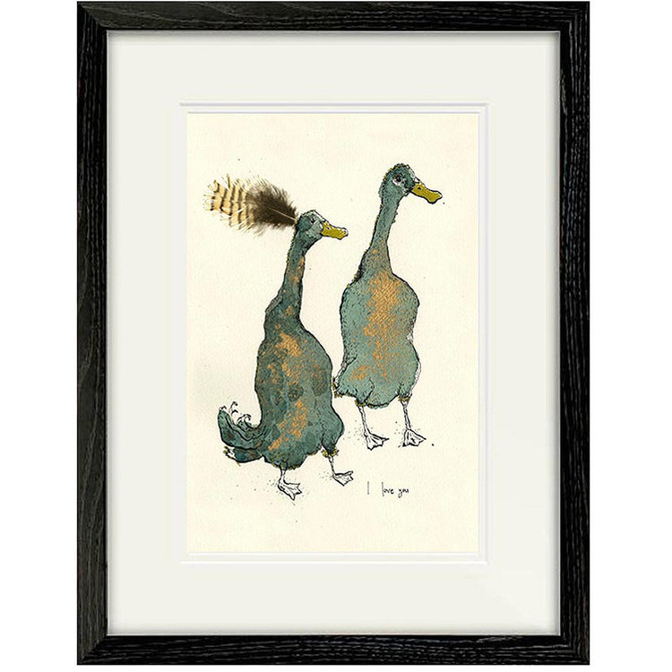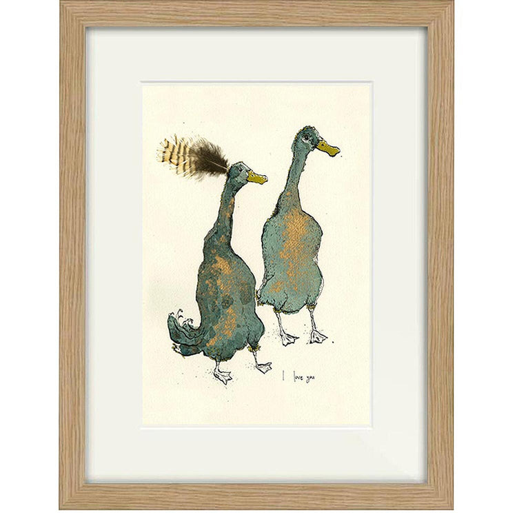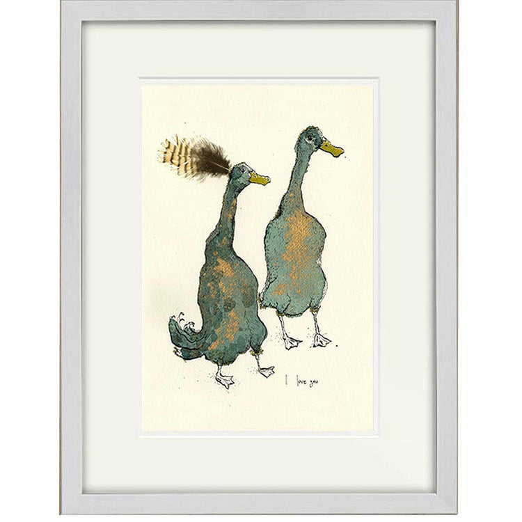 A high-quality giclee print of two loving ducks, with the handwritten text 'I love you'.