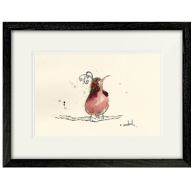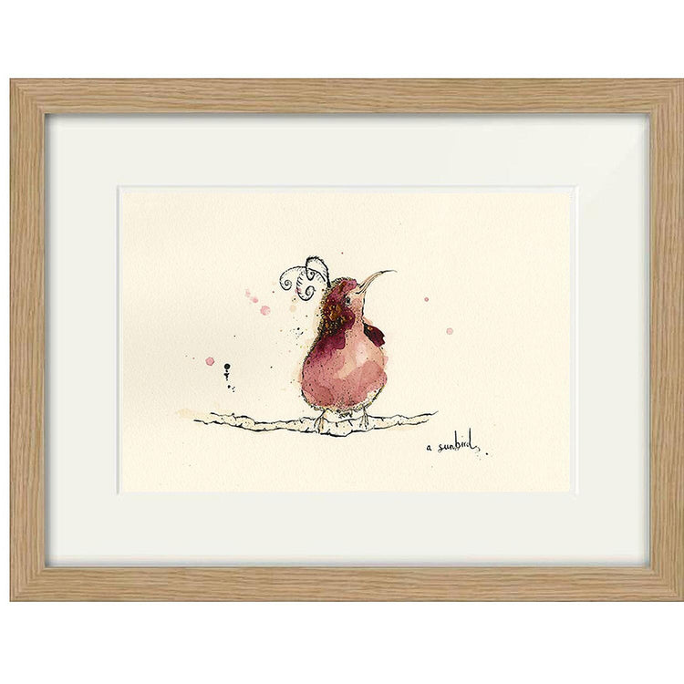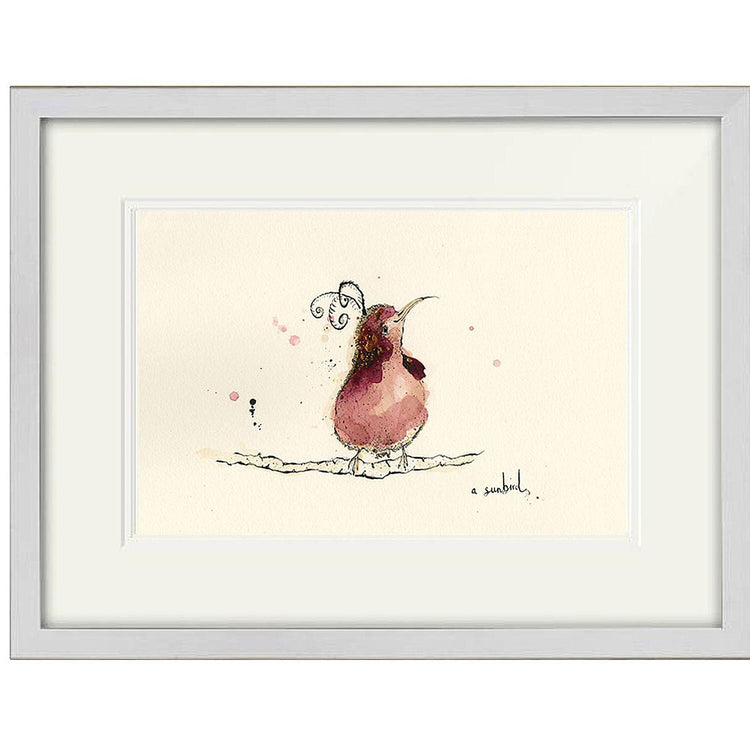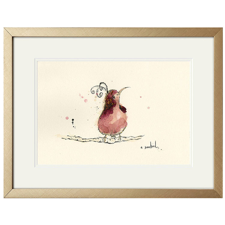 A high-quality giclee print of a Sunbird perched on a branch, with the handwritten text 'a sunbird'.