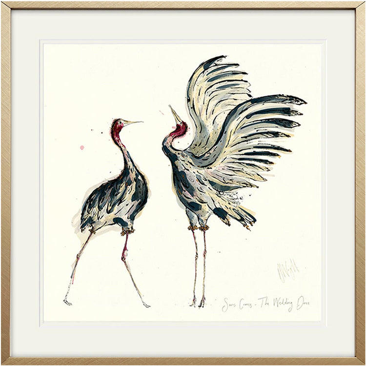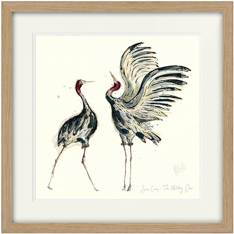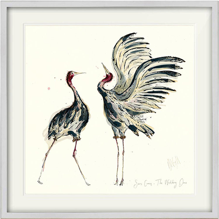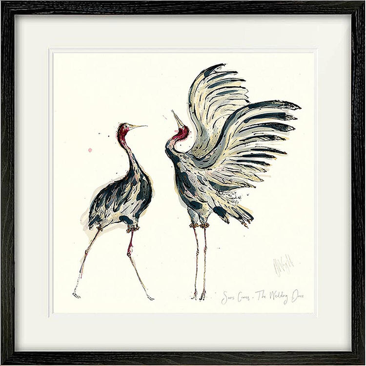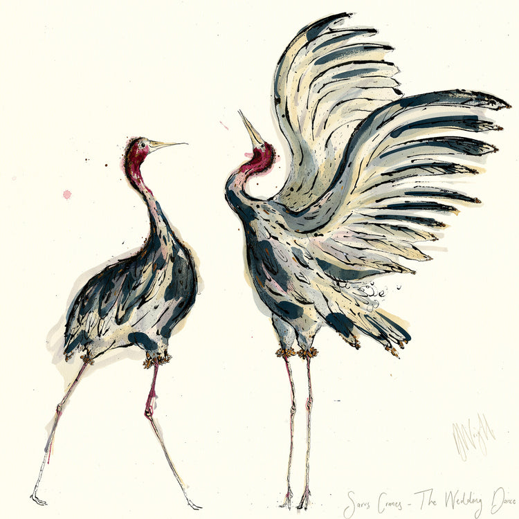A high-quality giclee print of two Sarus Cranes, with the handwritten text 'Sarus Cranes, The Wedding Dance'