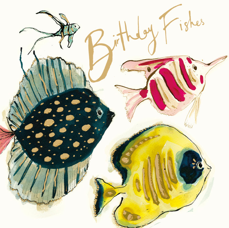 A gold foil embossed birthday card illustrated with a shoal of colourful fish and the handwritten text ’Birthday Fishes’.