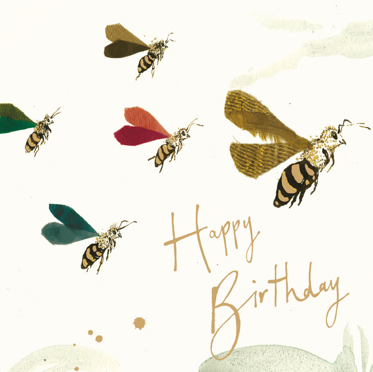 A gold foil embossed birthday card illustrated with a friendly cluster golden bees and the handwritten text ’Happy Birthday’.