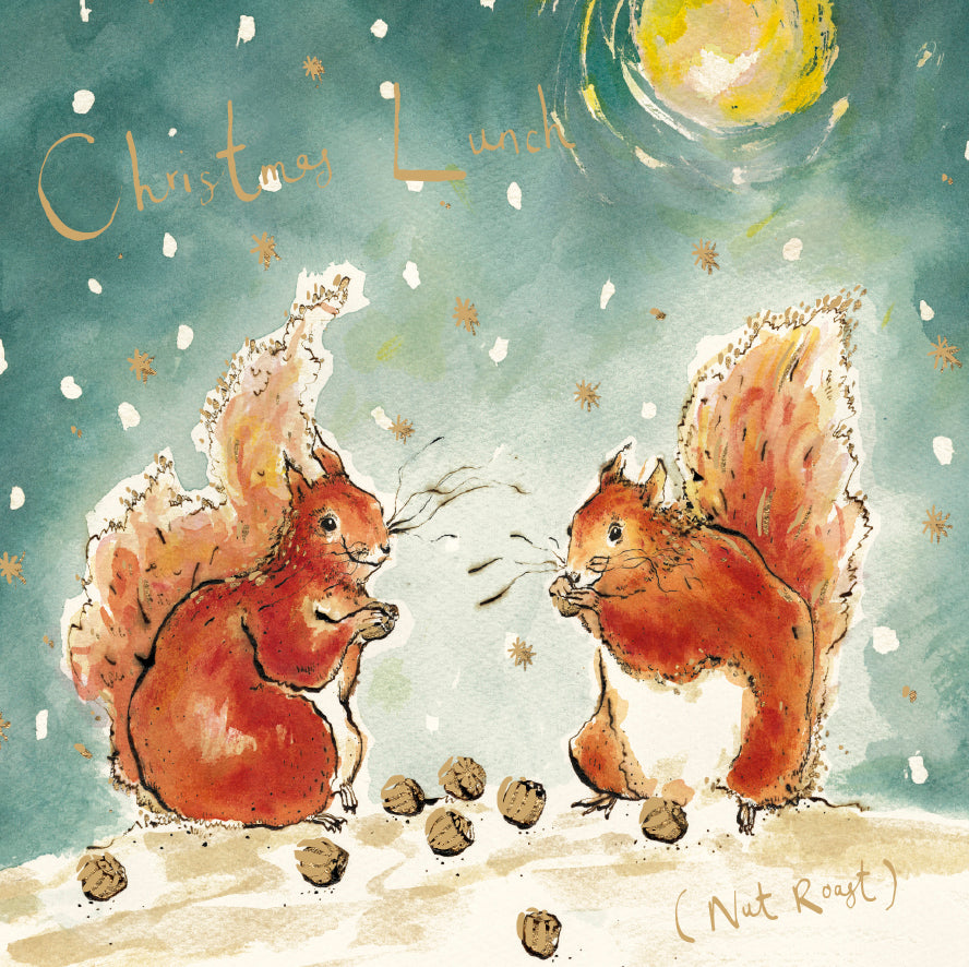 A gold foil embossed Christmas card illustrated with two cheeky Red Squirrels eating their Christmas Lunch under the falling snow and the hand written text ‘Christmas Lunch (nut roast)’.