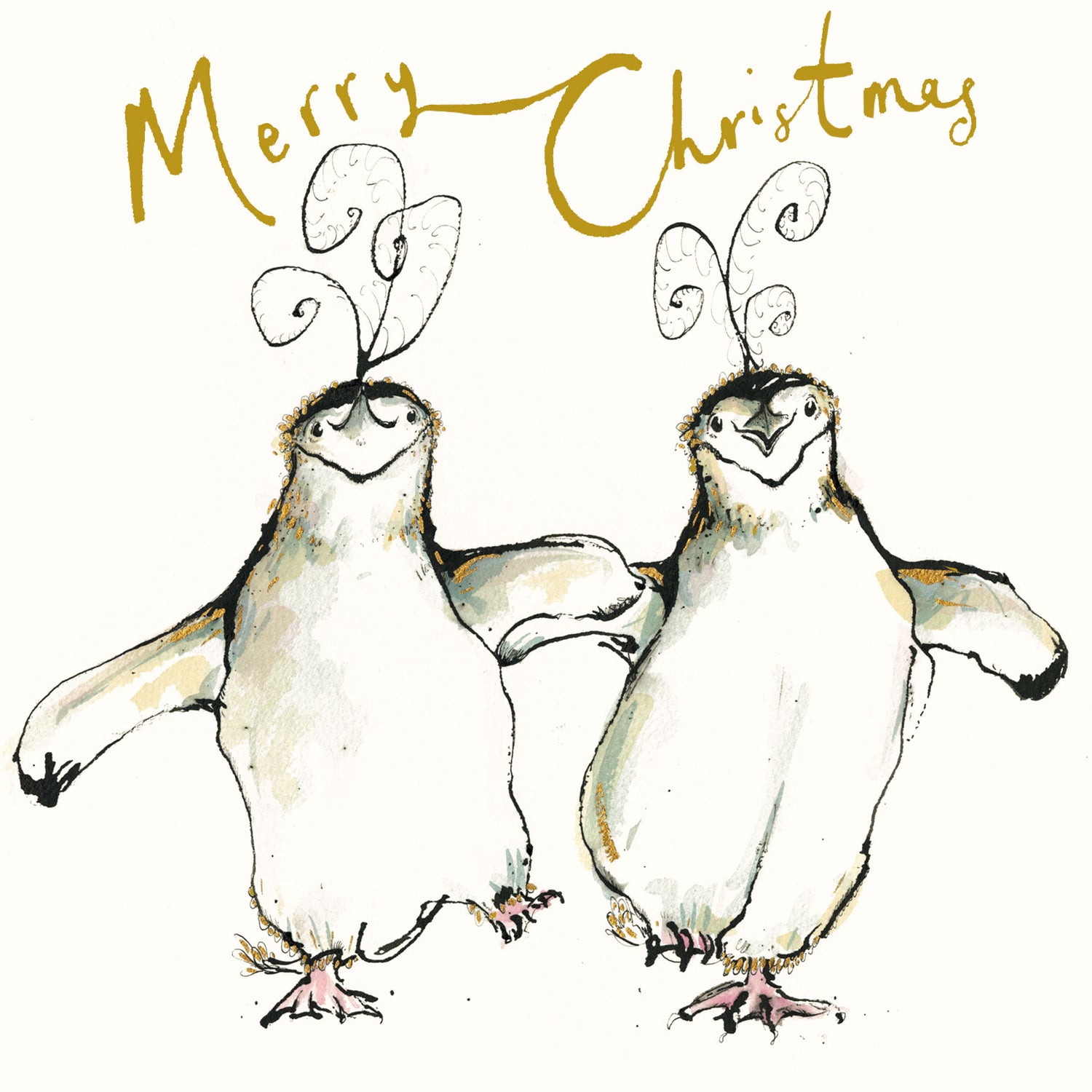 A gold foil embossed Christmas card illustrated with two merry festive penguins and the handwritten text 'Merry Christmas'.