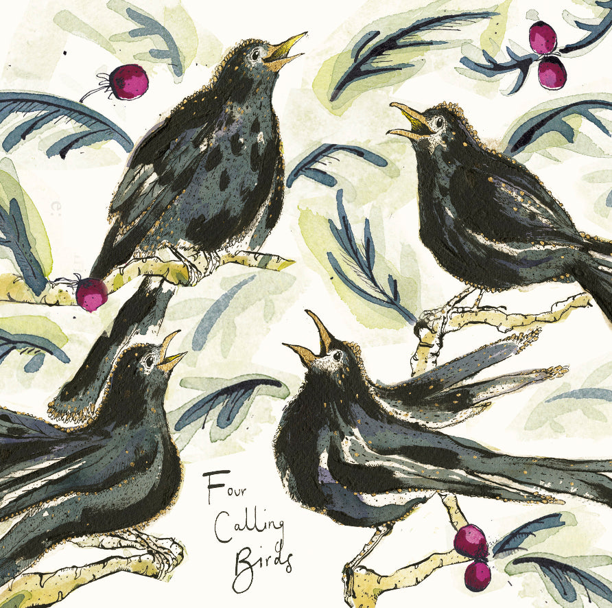 A Christmas card illustrated with four calling birds sat amongst red berries and the hand written text ‘Four Calling Birds’.