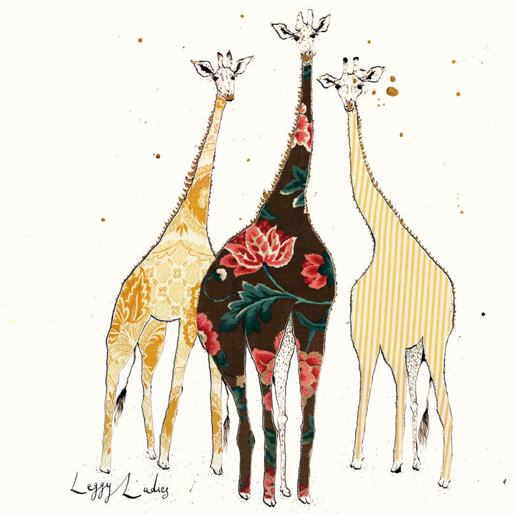 A greetings card illustrated with three slender Giraffes and the handwritten text ‘Leggy Ladies’.