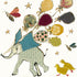 A gold foil embossed card illustrated with a happy big eared elephant, two bees, two chicks, some stars and a big bunch of colourful balloons.