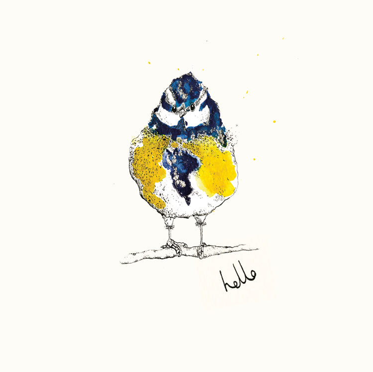 A greetings card illustrated with a little Blue Tit and the handwritten text ‘Hello’.