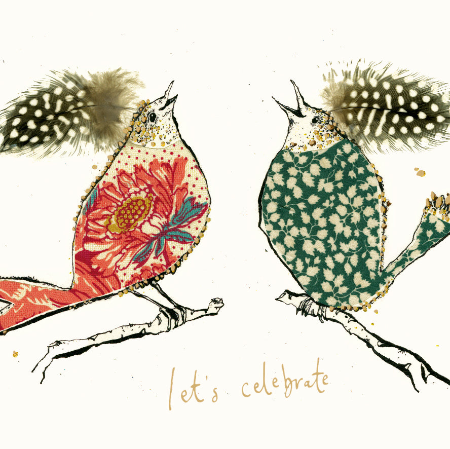 A gold foil embossed card illustrated with two singing, fabric patterned, birds and the handwritten text ‘let’s celebrate’.